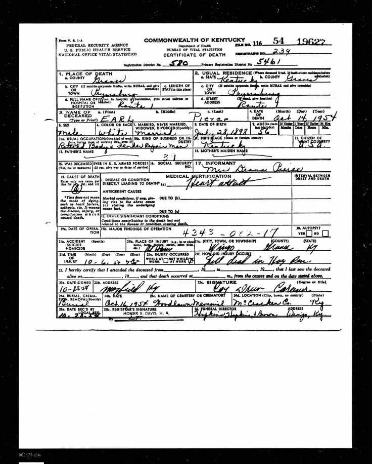 3. “Kentucky, Death Records, 1852-1964,” digital images, Ancestry.com (http://www.ancestry.com: accessed 10 May 2017, entry for Earl Pierce, 1954; Graves County, Kentucky.