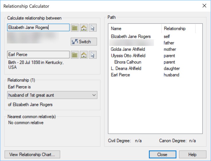 Family Tree Maker® Relationship Calculator for Earl Pierce, the husband of my first great aunt, L. Deana Ahlfield, and me.  I have blurred out the names of living people, as well as my own personal information.